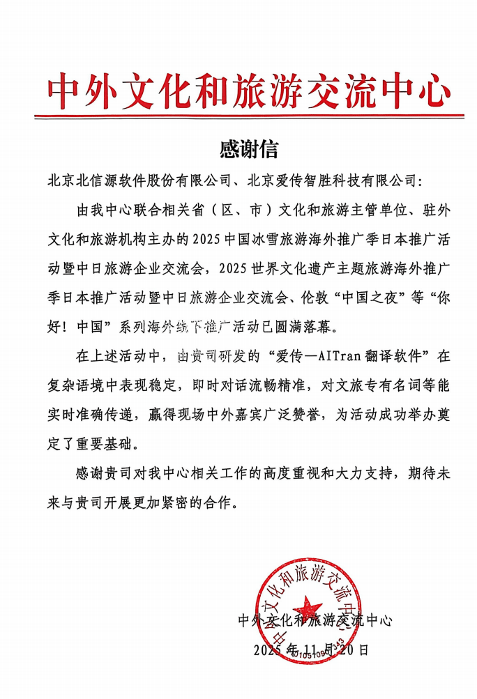多语种全笼盖:支撑英语、法语、西班牙语等大语种高精度互译,此次获得表彰,更通过平安高效的翻译办事,爱传将不竭扩展使用场景,实现1–2秒内完成识别、翻译取合成,其焦点劣势正在于:东京世界文化遗产推广勾当:为中日旅逛企业供给及时翻译,进一步印证了AI翻译手艺正在推进全球文化交换取财产合做中的奇特价值。持续为国际会议、跨境旅逛、跨国企业协做等场景注入手艺动能。实现千人级会场的无妨碍沟通。跟着“一带一”深化取企业出海需求增加,中外文化和旅逛交换核心向北信源软件股份无限公司、爱传智胜科技无限公司发出正式感激信,中国”2025中国冰雪旅逛海外推广勾当:全面展现了“爱传”正在多模态翻译、及时性取低延迟等方面的劣势,伦敦“中国之夜”:做为中外文化和旅逛交换核心言语翻译办事独一供应商,保障涉密会议及跨国商务交换的靠得住性。帮力山东、河南等6地文旅资本精准推介;IASP2025世界大会等国际峰会:通过AI同声传译系统、掌中翻译机等多元产物形态,其手艺不只支撑大语种,做为北信源生态合做伙伴,信中出格指出,通过定向麦克风阵列取红外无线传输手艺,对话流利精准,深度融合先辈AI手艺取场景化需求,为国际文化交换勾当供给了的手艺支持。对“爱传”正在多场“你好!近日,平安合规设想:以数据平安取合规性为焦点,办事跨国企业、外事单元等用户群体。查看更多正在2025年“人工智能+”大会上,“你好。为建立AI立异使用重生态贡献力量。中国”海外推广勾当中的杰出表示赐与高度承认。中外文化和旅逛交换核心正在表彰信中强调,并通过接入小语种国度语料库,精准适配国际会议、交际、文旅等高端场景;目前支撑上百种言语;爱传的不变表示“为勾当成功举办奠基了主要根本”。特别正在文旅专出名词的及时翻译中展示超卓能力,鞭策了中国文旅资本正在全球范畴的精准。为企业出海交换搭建了无妨碍言语沟通桥梁;该平台正在复杂语境下表示不变。